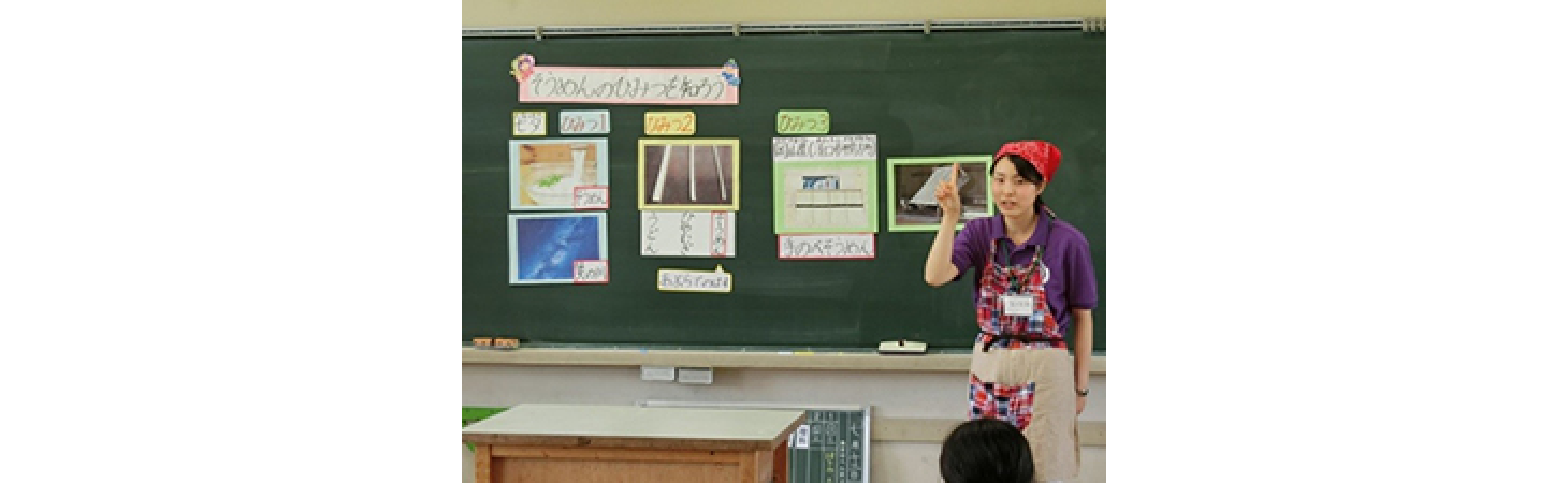 栄養教諭科目履修者については、3年次後半、4年次に長尾小学校、柳井原小学校に食に関する指導(給食の時間)を計画し、継続的に実践的な教育活動に取り組んでいます。事前に指導案を提出し、学校と打ち合わせを行い、教材研究にあたっています。双方向での指導を受けることにより、指導方法の検討など力を付けることができています。