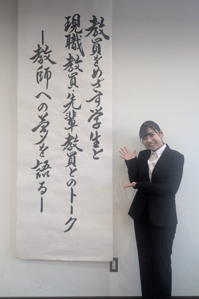 本学部から,4年生の梶谷萌恵さんが出演しました。梶谷さんは,教員を志した理由や教員になる上での不安・疑問点などをわかりやすく語り,会を盛り上げました。