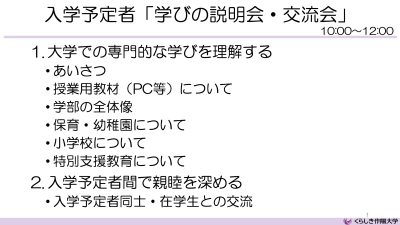 現段階で来年度子ども教育学部への入学が内定している「入学予定者」に集まっていただき,標記の会を開催しました。予定していたほぼ全員の参加を得ることができました。