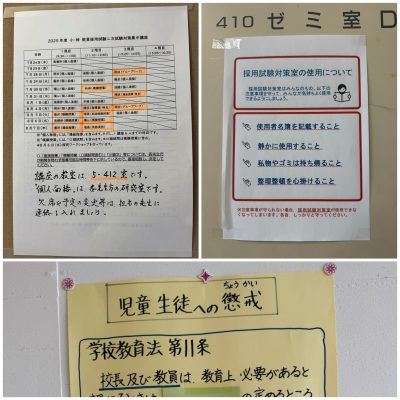 採用試験に挑戦する学生たちの中には,連日大学へ足を運び,合格を目指して様々な準備を進めている者が大勢います。写真左上の表にある「集中講座」も開催していますが,それ以上に複数の教員の研究室を何度も何度も訪ねて,面接や模擬授業などの練習・準備を繰り返している学生もいます。自分の夢を実現するためにいっしょうけんめいがんばる学生たちを,我々教員も精一杯応援しています。