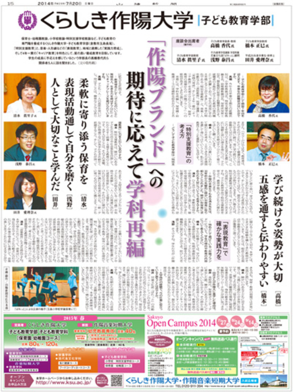 7月20日(日)山陽新聞朝刊紙面において、本学子ども教育学部の特色や取り組み、学科再編による保育園・幼稚園コースの定員増(80名→120名)などについて、座談会形式で紹介した特集ページを掲載いたしました。