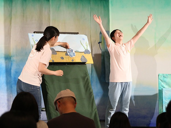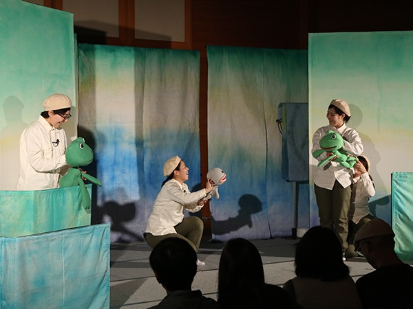 講座の前半は、先駆的に乳幼児向け舞台芸術の創作と上演に取り組んできた2つの創造団体である「山の音楽舎(神奈川県)」、「人形劇団ひぽぽたあむ(東京都)」と本学子ども教育学部附属児童文化部ぱれっとによる乳児向け舞台芸術の素材上演が行われました。