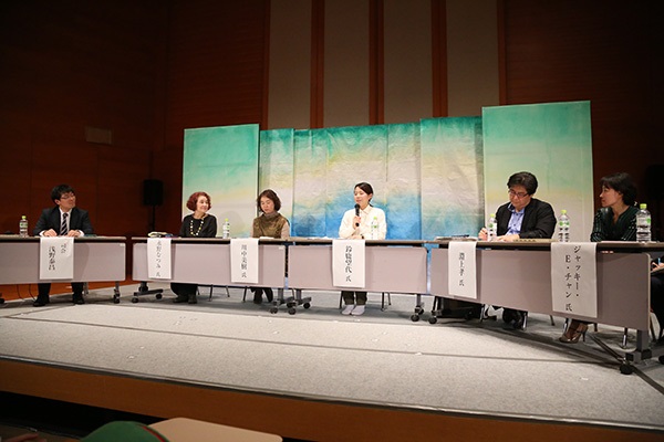 講座の後半は、「乳児向け舞台芸術のフロンティア」をテーマにシンポジウムを開催しました。シンポジストとして、永野むつみ氏(人形劇団ひぽぽたあむ)、川中美樹氏(山の音楽舎)、本学子ども教育学部附属児童文化部ぱれっとの学生代表が登壇。助言者として、淵上 孝氏(文部科学省初等中等教育局幼児教育課長、内閣府子ども・子育て本部参事官)、ジャッキ―・E・チャン氏(ウンソン医療財団神経科学芸術院、韓国芸術総合学校演劇院)にご登壇いただきました。