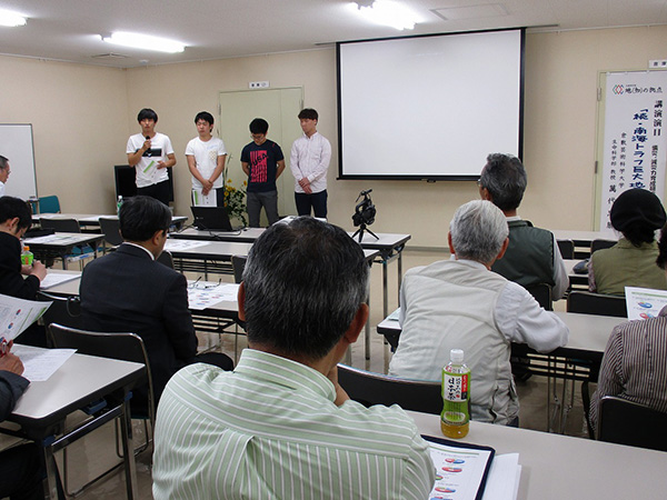 その後は、萬代先生とともに東日本大震災の被災地視察・調査を行った学生4名が登壇しました。被災地視察を通しての感想や、昨年秋に実施したアンケート調査・分析を通して感じたことについての報告がありました。