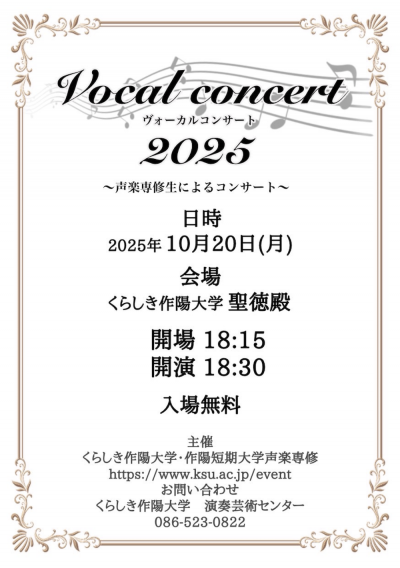 ヴォーカルコンサート2025 ツイート 公演日程 2025年10月20日(月) 開場/開演 開場 18時15分 / 開演 18時30分 会場 聖徳殿(くらしき作陽大学・作陽短期大学内) 料金 無料 チケット取扱 ー 声楽専修生によるコンサート 主催 くらしき作陽大学音楽学部・作陽短期大学 声楽専修 お問い合わせ くらしき作陽大学演奏芸術センターTEL:086-523-0822 一覧へ戻る