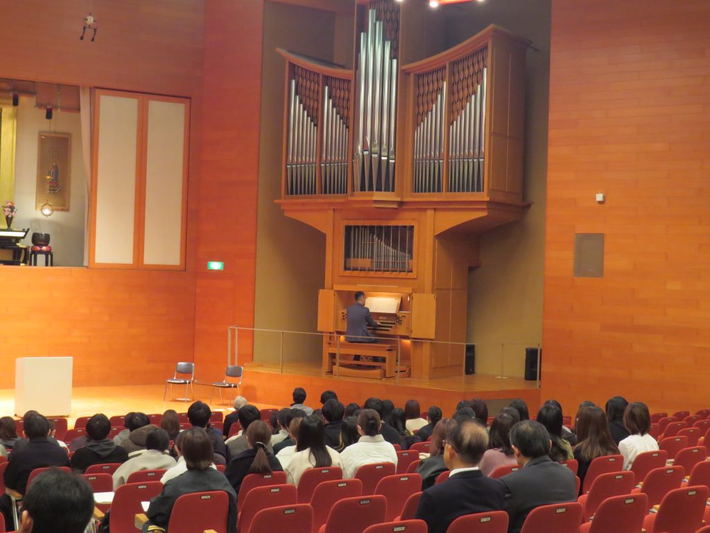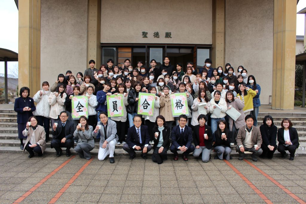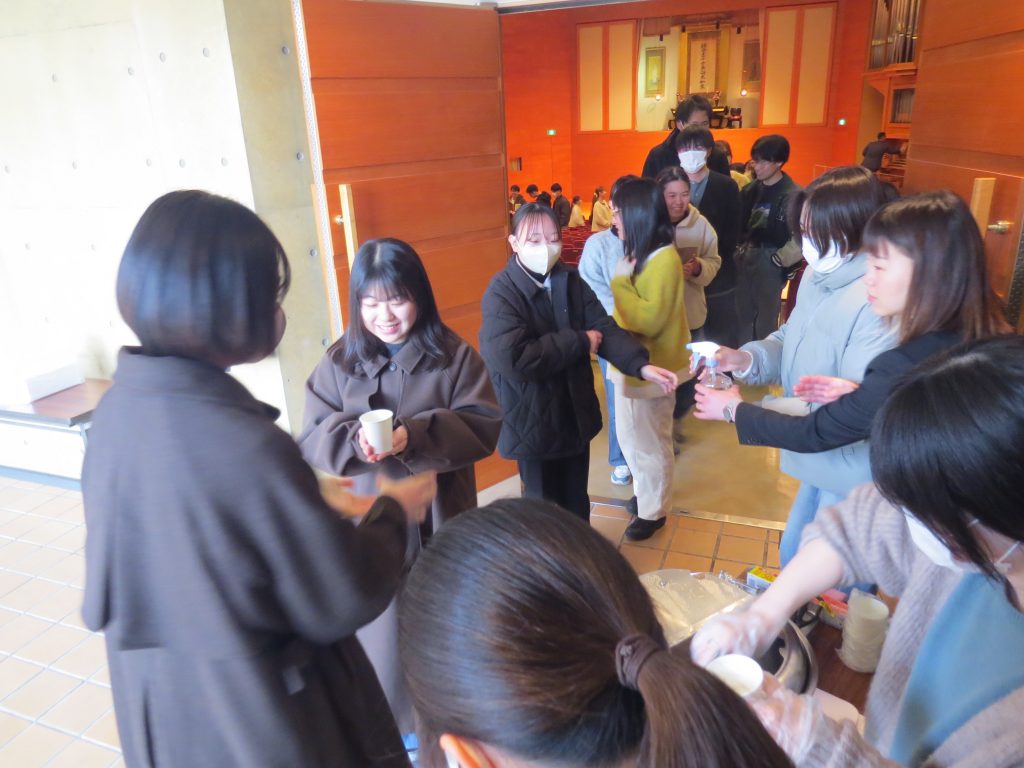 受験を控えた食文化学部 栄養学科4年生へ向けて、松田学長、木村食文化学部長から激励の言葉が贈られたのち、音楽学部の重利講師によるパイプオルガンの演奏でエールを送りました。激励会終了後には、栄養学科3年生が作った甘酒が振る舞われ、聖徳殿前で記念撮影を行いました。