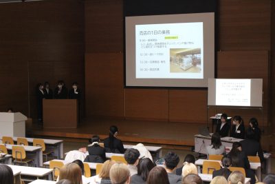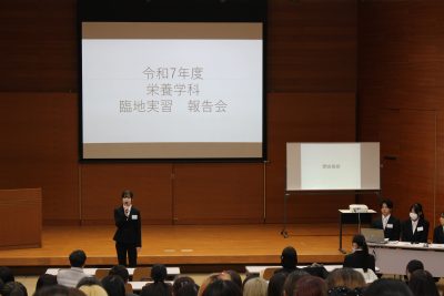 報告会では,各実習先での経験や学びの成果を発表し,管理栄養士の役割や専門性について理解を一層深めました。当日は1・2年生も参加し,臨地実習への意欲と関心を高める有意義な機会となりました。