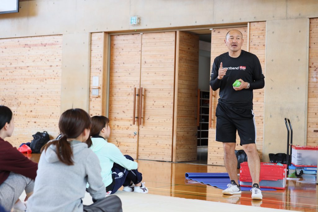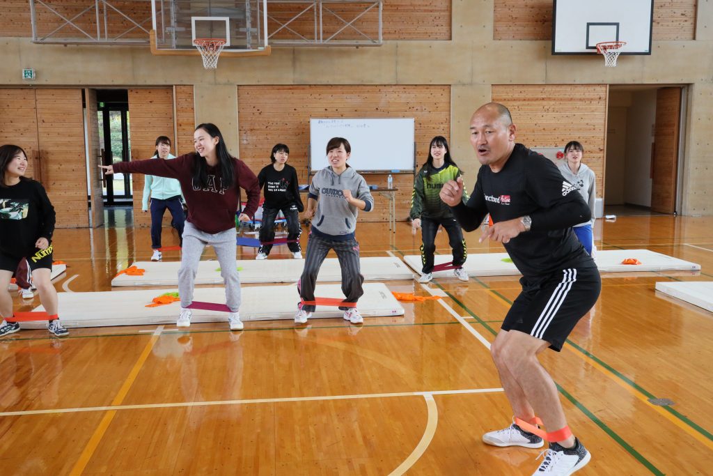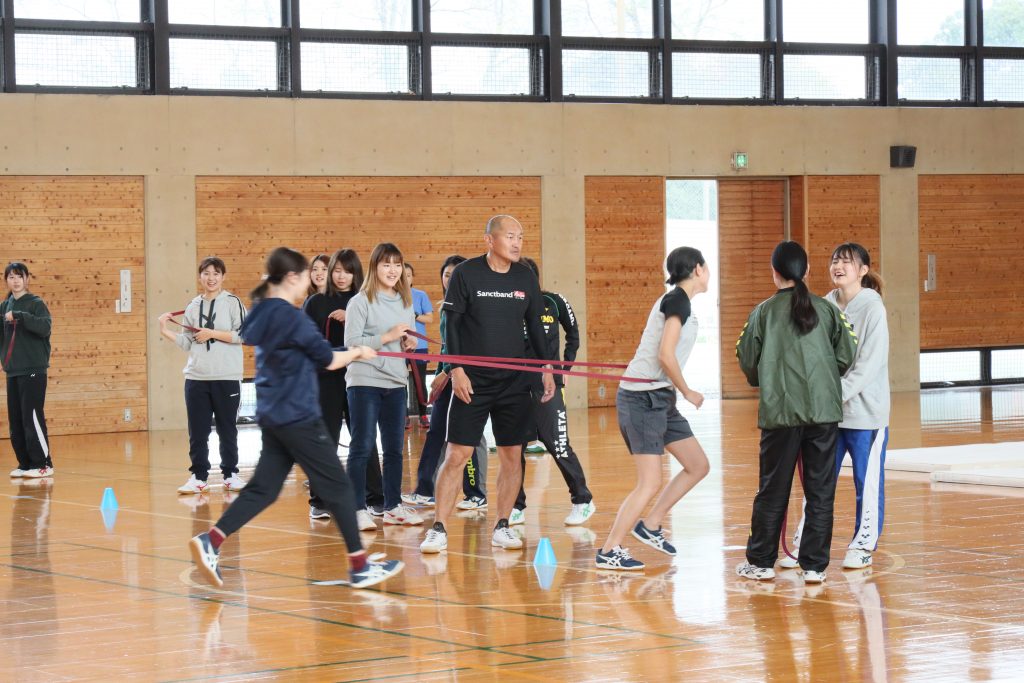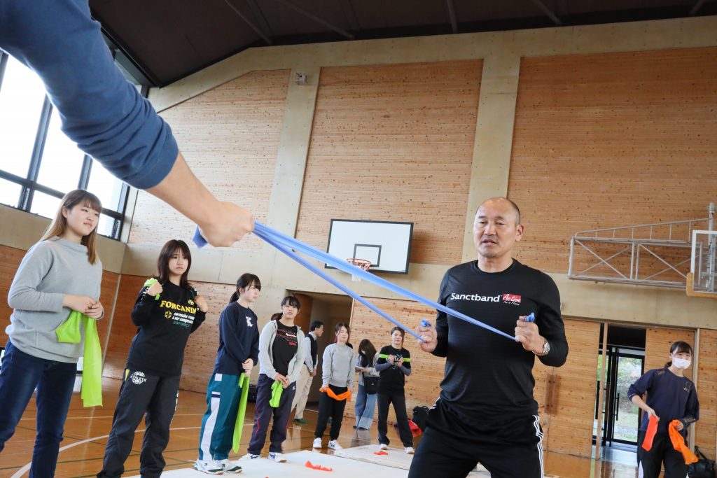 「筋力トレーニングの実際(チューブを使用したトレーニング方法)」について授業を実施しました。