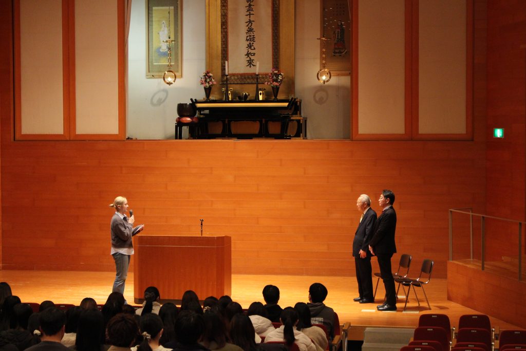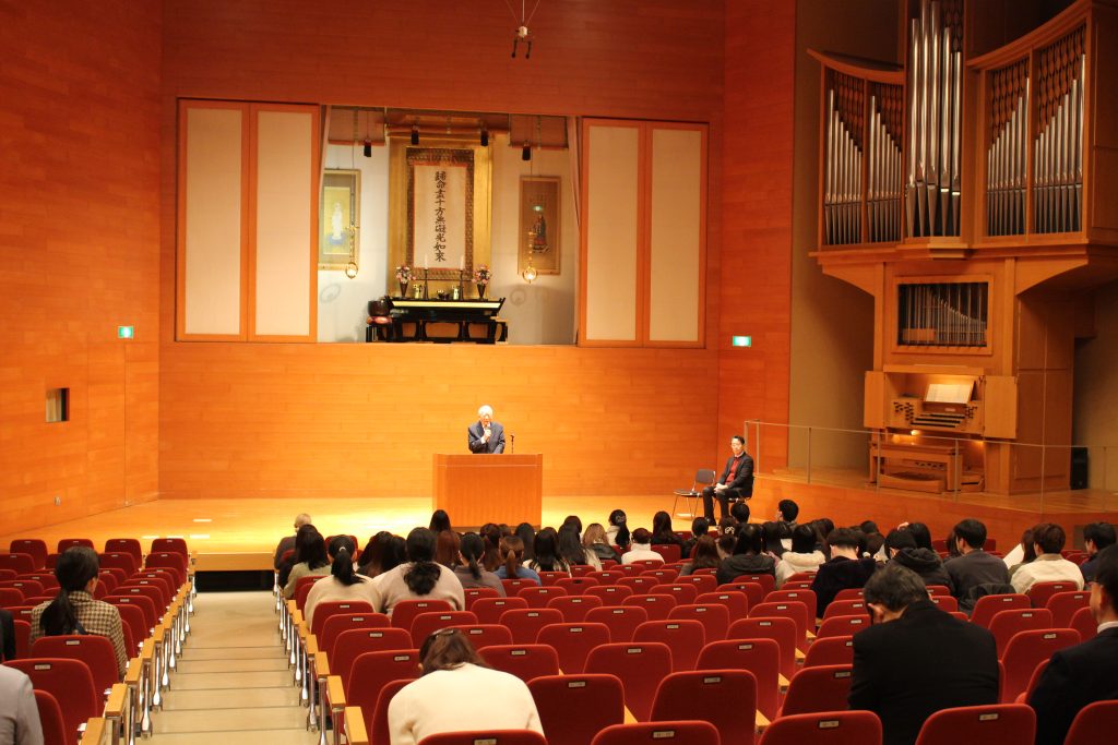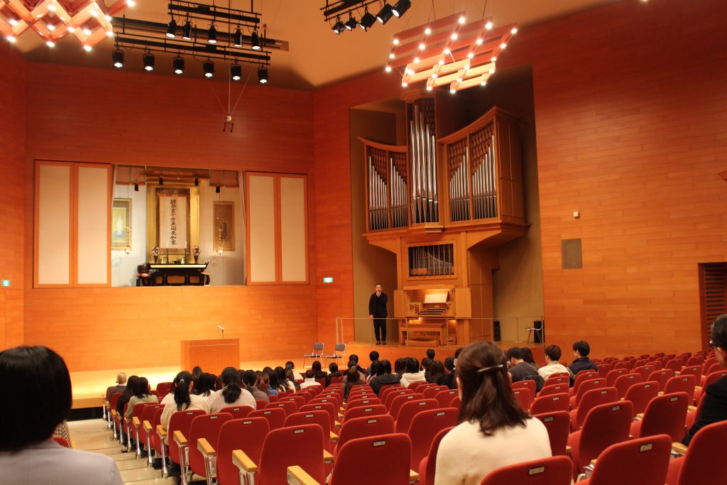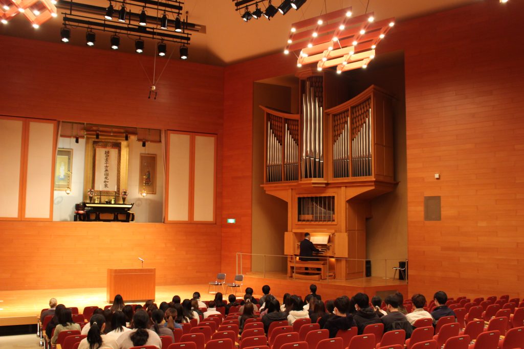 受験を控えた食文化学部栄養学科4年生に向けて、松田学長、木村食文化学部長から激励の言葉が贈られた後、音楽学部の重利講師によるパイプオルガンの演奏が行われ、受験生へエールが送られました。