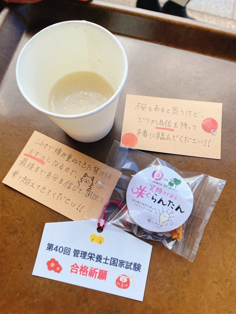激励会終了後には、栄養学科3年生が心を込めて作った甘酒が振る舞われ、参加者は聖徳殿前で記念撮影を行いました。