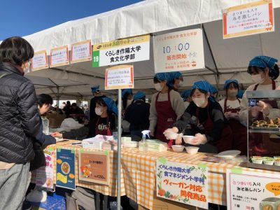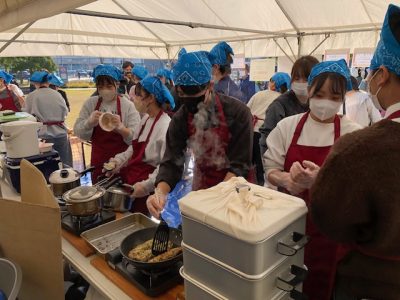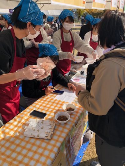 倉敷市が主催する「くらしき農業祭り」は、毎年多くの来場者でにぎわう恒例のイベントです。今年は全43団体が出店し、その一つとして、食マネジメント学科の学生と教員が授業の一環として米粉麺・米粉料理の提供を行いました。