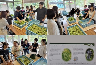 食文化学部では、体験型教育の一環として、倉敷未来プロジェクト(倉敷市)のご協力のもと、玉島にある“船穂ワイナリー https://www.funaowinery.com/”を訪問しました (2025年9月10日)。栄養学科と食マネジメント学科から学生21名と教員4名が参加し、マスカット・オブ・アレキサンドリアの収穫体験やワイン醸造の見学を行いました。学生たちは地域で大切に育てられたブドウに直接触れながら、生産の魅力やものづくりの奥深さを実感していました。