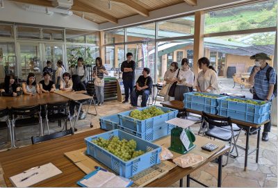 さらに、高梁地区に自生する野生種ブドウ(シラガブドウ)とマスカット・オブ・アレキサンドリアを掛け合わせて誕生した新品種「マスカット・シラガイ」を使ったスイーツ開発について、学生たちがアイデアを出し合う場面も見られ、創造力あふれる学びの時間となりました。