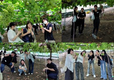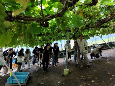 食文化学部では、体験型教育の一環として、倉敷未来プロジェクト(倉敷市)のご協力のもと、玉島にある“船穂ワイナリー https://www.funaowinery.com/”を訪問しました (2025年9月10日)。栄養学科と食マネジメント学科から学生21名と教員4名が参加し、マスカット・オブ・アレキサンドリアの収穫体験やワイン醸造の見学を行いました。学生たちは地域で大切に育てられたブドウに直接触れながら、生産の魅力やものづくりの奥深さを実感していました。