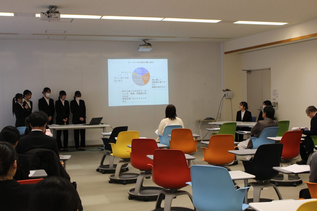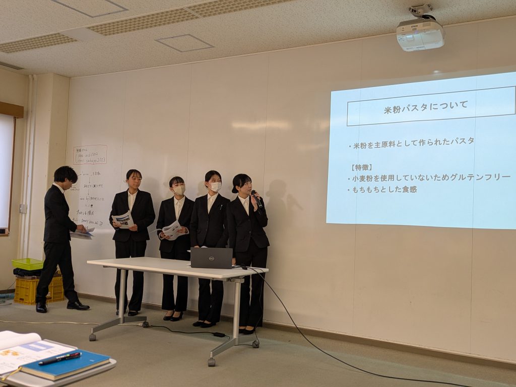 当日は、本授業を履修する3年次学生19名が参加し、「米粉麺および米粉を使用したヴィーガン対応の商品・レシピ開発」をテーマに、5グループが開発した商品の特徴や、「くらしき農業まつり」において実施したアンケート結果について発表しました。