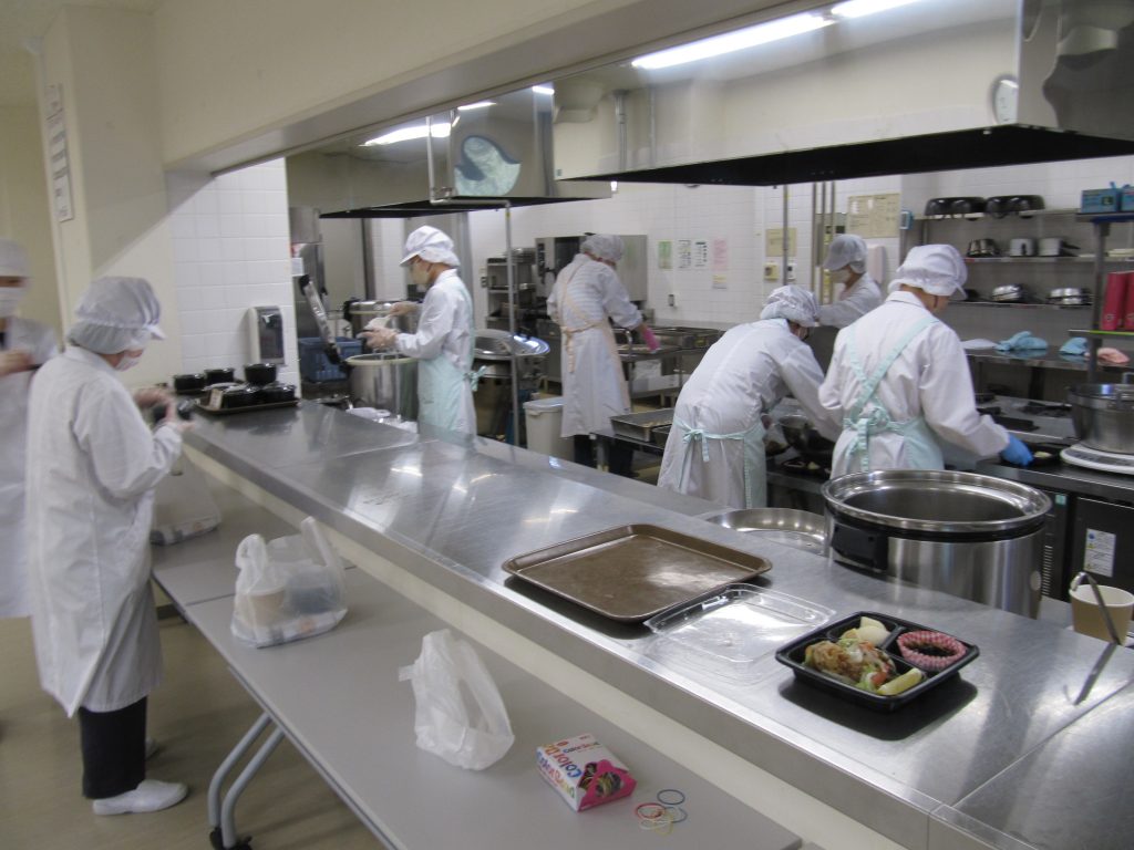 多くの学生の皆さんや教職員の方々で賑わっています。感染症対策としてテイクアウト方式で運営しています。もちろん、食材の調理方法から容器やラッピングまで、学生たちが試行錯誤を繰り返しながら奮闘しています。
