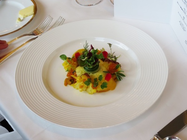 フランス料理のメニュ-構成や食材、食器・カトラリ-類の種類と扱い、行事食など丁寧な講義と具体的な実践授業を受けました。季節の多彩な食材を使用したメニュ-は、香辛料・乳製品も多くバラエティに富んだ内容で、「エスプ-マ」(「泡」を使う調理法)の料理も味わい、食を学ぶ学生等の見識を深める楽しく有意義な学修となりました。