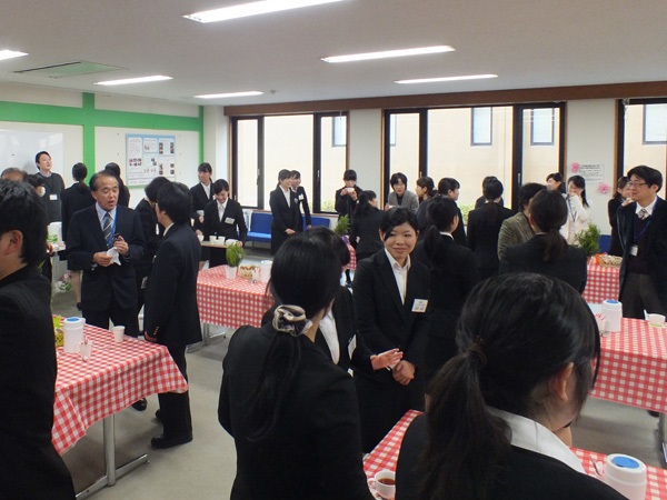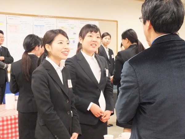 発表者は実習先で学んだ内容を、施設ごとのテーマに基づいて学生や教員、実習先でお世話になった先生方に報告発表しました。1日かけて行われた報告会の間には、30分のティータイムを開催し、学生が教員や実習先の担当の先生と実習体験を話し合っていました。