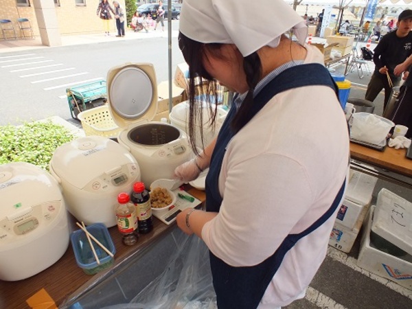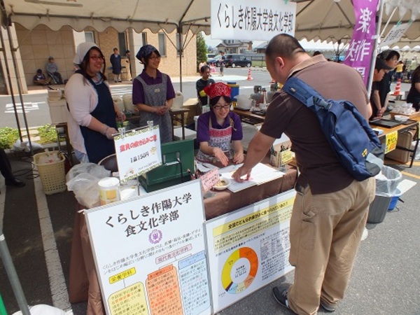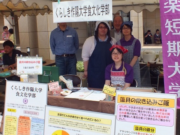 5月18日(日)本学食文化学部が「玉島産ばぁ~カーニバル」に出店しました。米食・地産地消の販売や展示を行う「食育体験ブース」で、ばらずしや赤貝の缶詰でお馴染みの藻貝を使った炊き込みご飯『藻貝の炊き込みご飯』を販売しました。