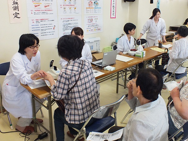 今年のテーマは「咲かせよう!健康の花を長尾いっぱいに!」と題し、身体測定、体脂肪測定、血圧測定などの健康度チェックのほか、参加者全員での健康体操や学生が考案した健康レシピの試食会、学生による健康教育の講話など、健康に関する様々な内容で地域の皆さんに健康についての理解を深めていただきました。
