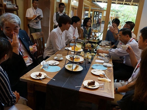 プレイベントでは、本学食文化学部 向後千里 准教授、kobacoffeeオーナーの小林氏、による挨拶のあと、町屋スタイルの建築と食生活文化との結びつきの説明や、食の専門家の卵である本学学生たちが考案した地元食材(白桃やピオーネ、連島ごぼうやれんこん)を用いたスイーツ等を知事の方々に堪能していただきました。