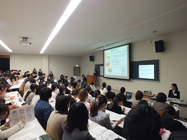 この報告会は、平成27年11月から12月に栄養学科の3年生が病院、特別養護老人ホーム、保健所などの61施設で行った、「臨床栄養学実習」「給食管理実習」「公衆栄養学実習」それぞれの実習で学んだ内容を施設ごとの発表テーマに基づいて報告発表しました。この報告会には栄養学科2年生も全員出席し、先輩の発表を熱心に聞いていました。