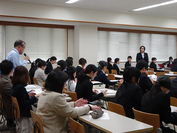 この報告会は、平成28年2月に現代食文化学科の3年生が保育園、事業所、病院、養護老人ホームなどの12施設で行った給食管理実習で学んだ内容を施設ごとの発表テーマに基づいて報告発表しました。この報告会には現代食文化学科2年生も出席し、先輩の発表を熱心に聞いていました。