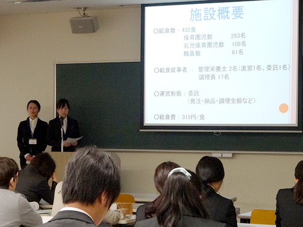 2月22日(月)本学6号館において、食文化学部現代食文化学科3年生による「平成27年度 給食管理校外実習Ⅱ報告会」を行いました。