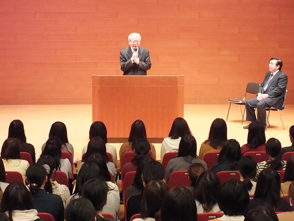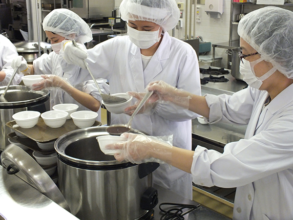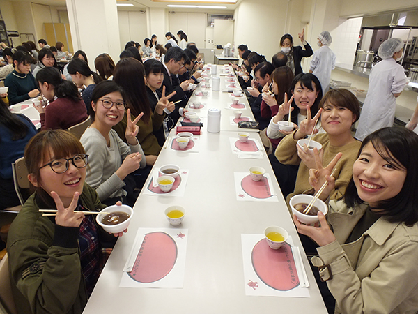松田英毅学長および宮本拓食文化学部長から激励の言葉が贈られ、パイプオルガンによる記念演奏が行われた後、試験合格を祈念して栄養学科3年の学生からぜんざいが振舞われました。