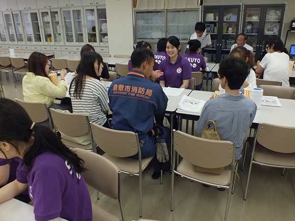 その後、倉敷市防災危機管理室 主幹 河田氏と倉敷市玉島消防署 消防士長 川上氏に「熊本の被災地に行っての体験談」をテーマに講話をしていただきました。また、地域の方々、本学学生・教職員でグループディスカッションを行い、災害時に必要なことを考え、災害に備えることの大切さを改めて学びました。