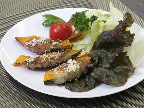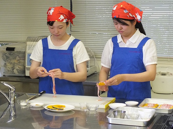 この番組では「簡単、美味しく、健康に!」をテーマに、食文化学部栄養学科教授の柳井ゼミにて考案した料理と健康ポイントを毎回紹介しています。本年度1回目の収録となった今回の献立は「かぼちゃの豚バラロール焼き」と「簡単ティラミス」です。番組収録には柳井ゼミの学生7名が参加し、調理やナレーションを担当しました。
