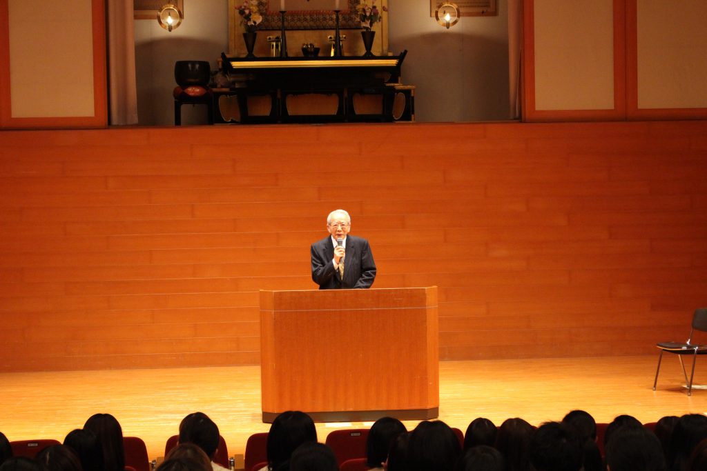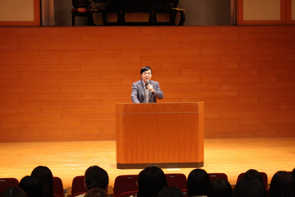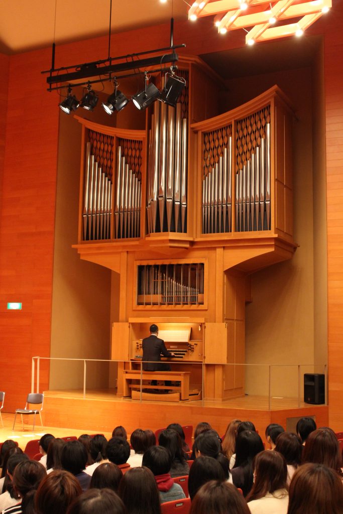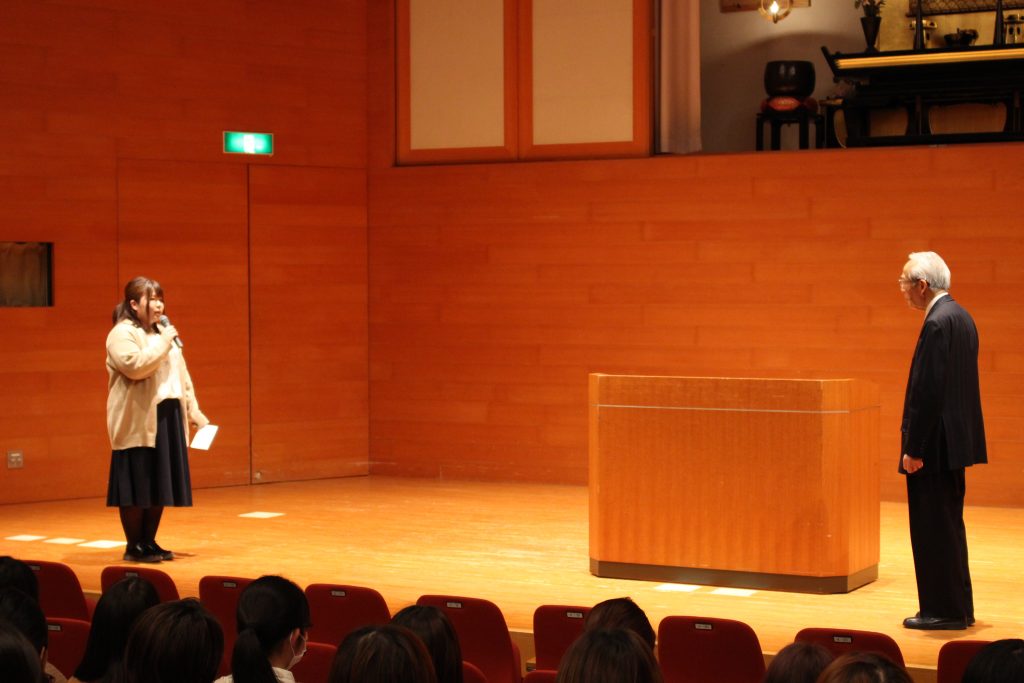 松田英毅学長および宮本拓食文化学部長から激励の言葉と、本学音楽学部 重利和徳講師によるパイプオルガン演奏が贈られ、栄養学科 4年生を代表して入江亜紀さんが感謝の言葉を述べました。