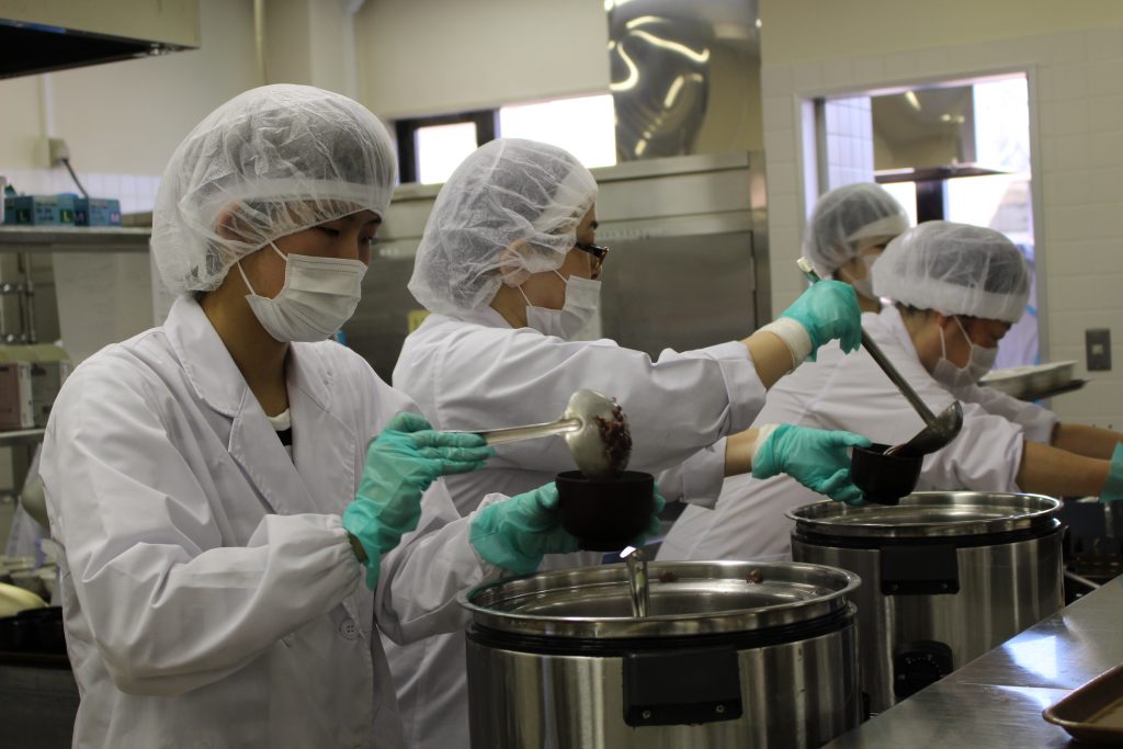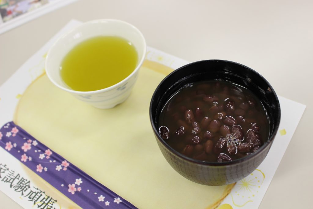 また、試験合格を祈念して栄養学科3年生から「試験で成果を出せるように」と願いを込めて、毎年恒例のお餅が入ったぜんざいが振舞われました。
