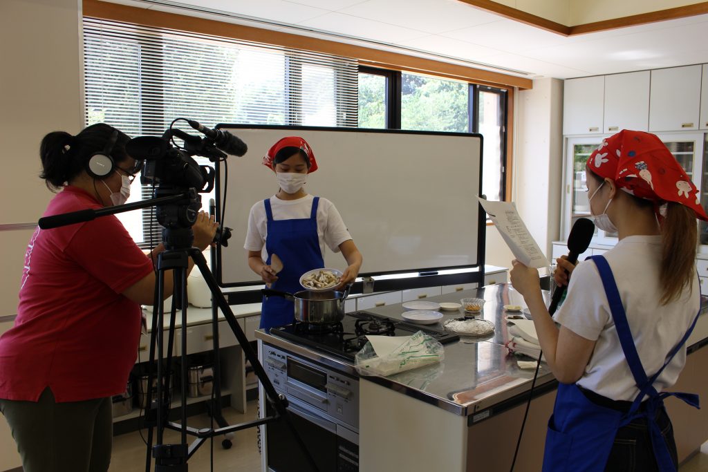 8月12日(水)本学5号館調理実習室において、玉島テレビ放送番組「SAKUYOクッキング」の収録が行われました。この番組では「簡単!おいしく!健康に!」をテーマに、食文化学部栄養学科の各ゼミで考案した料理と健康ポイントを毎回紹介しています。