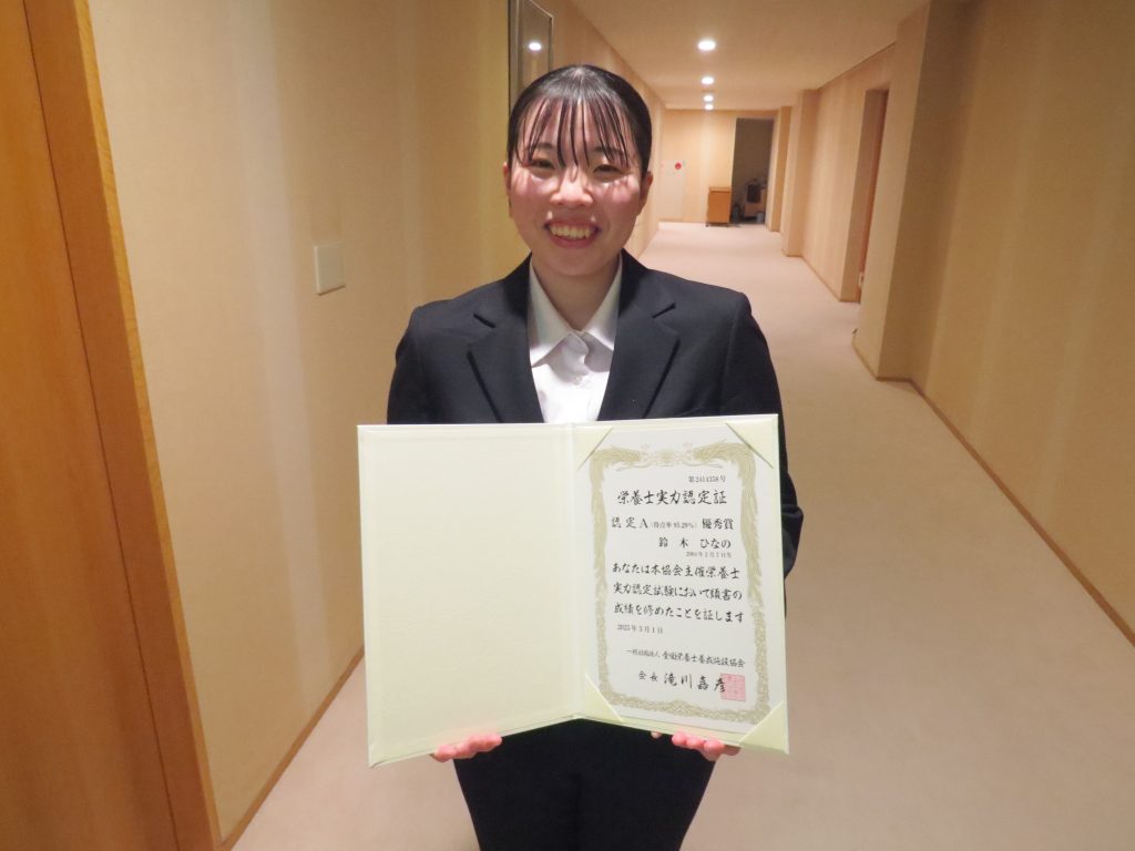 2024.12月実施された「栄養士実力認定試験」において、食文化学部現代食文化学科(2025.4より食マネジメント学科に名称変更)3年の鈴木ひなのさんが成績優秀者となりましたので、表彰式を行いました。