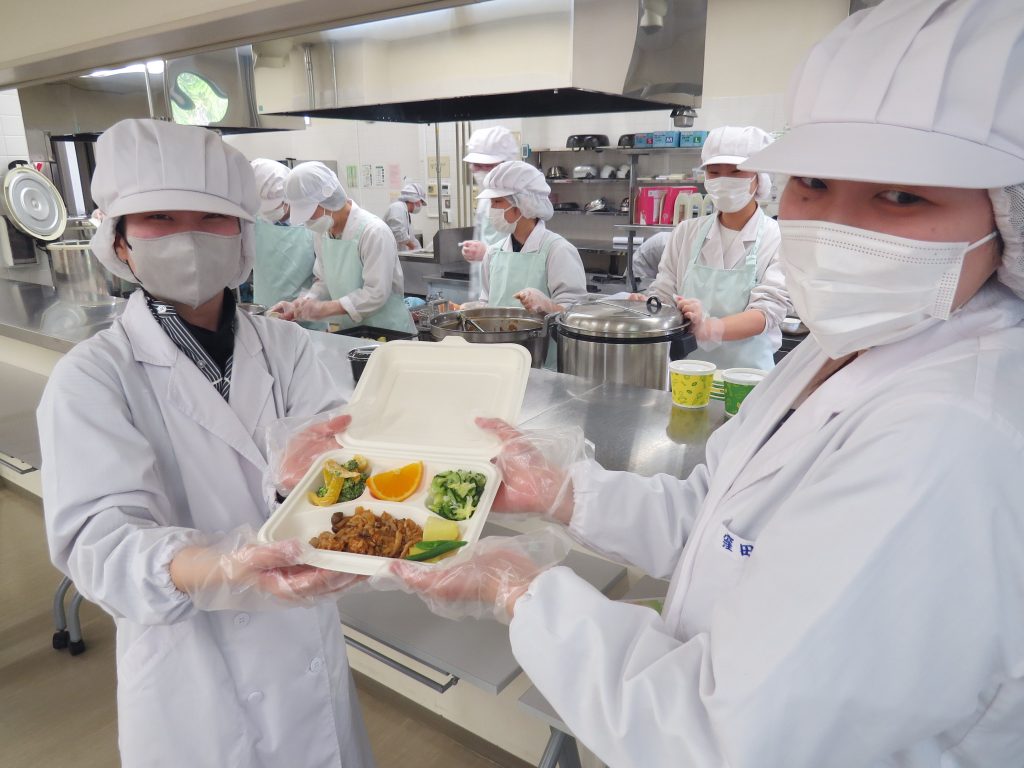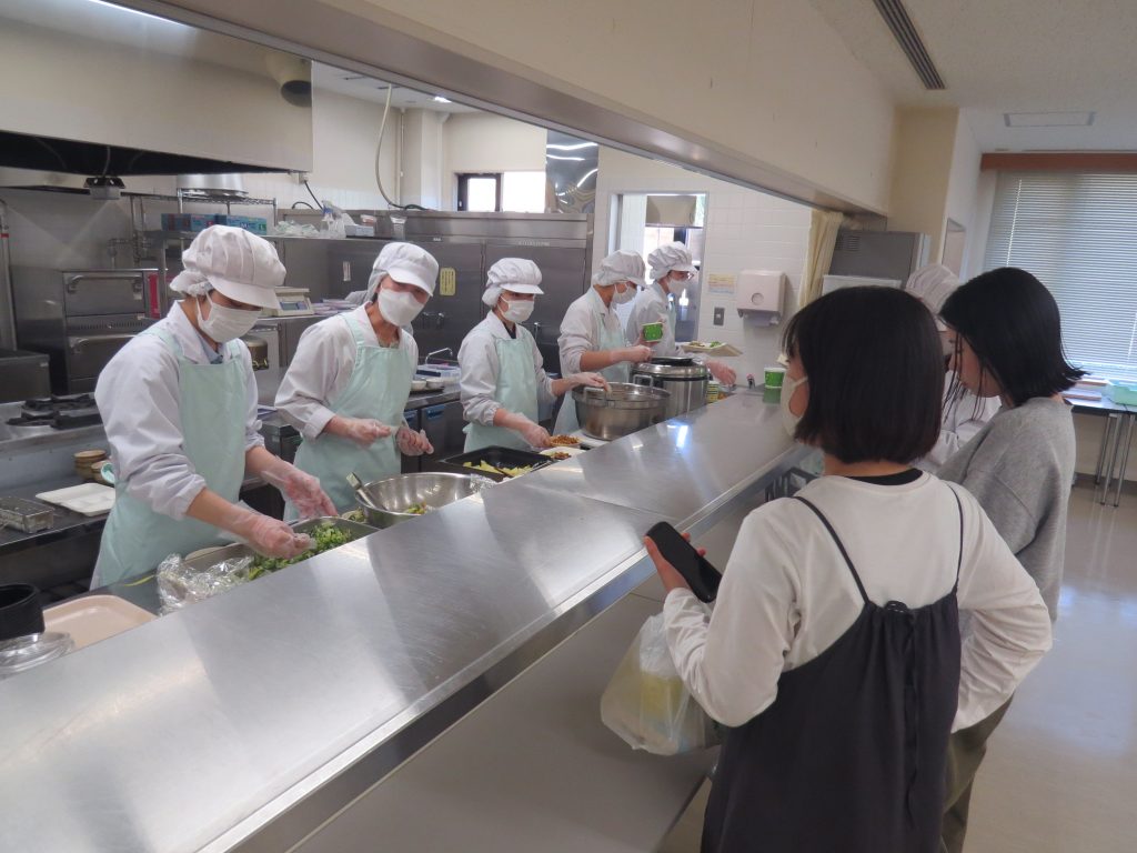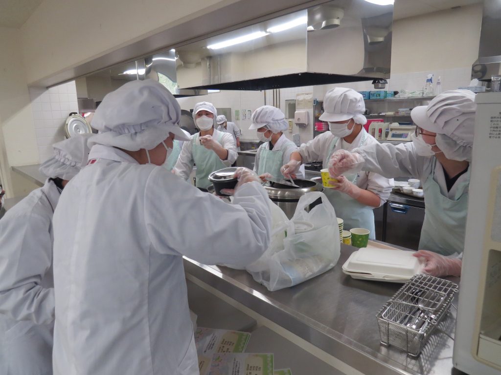 多くの学生の皆さんや教職員の方々で賑わっています。感染症対策としてテイクアウト方式で運営しています。もちろん、食材の調理方法から容器やラッピングまで、学生たちが試行錯誤を繰り返しながら奮闘しています。