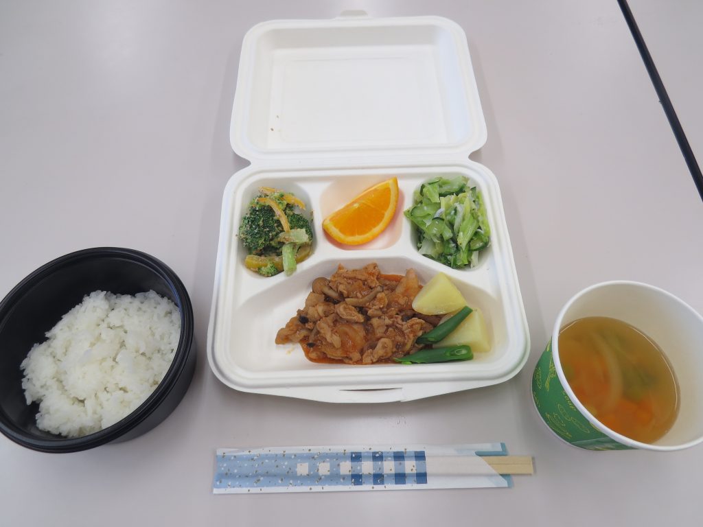 本日のメニューは、「ごはん(希望者は大盛りOK)、ハッシュドポーク、春キャベツのサラダ、ブロッコリーのごまマヨ和え、大豆ととアスパラガスのスープ、デザートオレンジ」でした。