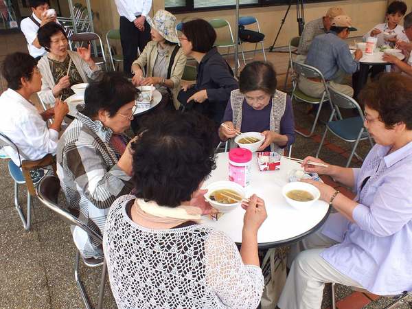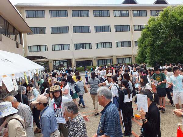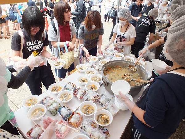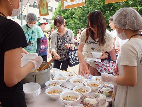 配食は昼休み時間(12:45~13:25)に中庭の特設テントで行い、喫食者300人分の食事を用意。学生・教職員をはじめ、地元コミュニティー協議会の方々などにも召し上がっていただきました。
