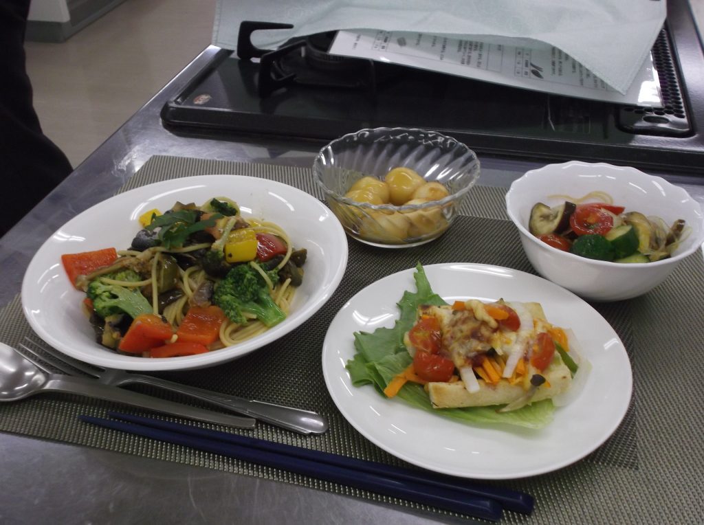 - チャレンジした献立は「オイルサーディンと夏野菜の和風パスタ」「油揚げピザ」「ピリ辛春雨サラダ」「とうふ団子」の4品です。調理の方法だけでなく、魚の缶詰や大豆製品を使ったピザや団子などたんぱく質をしっかり取りながら、野菜もたっぷり食べる工夫など柳井ゼミの4年生からアドバイスがありました。