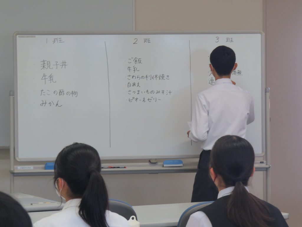 「学校給食で食育について考えてみよう」学校給食や栄養教諭について説明。管理栄養士として、食育の一環で学校給食のメニュー作りを学び、グループワークで、実際に地域の旬の食材を使って、給食のメニューづくりを行い、発表しました。