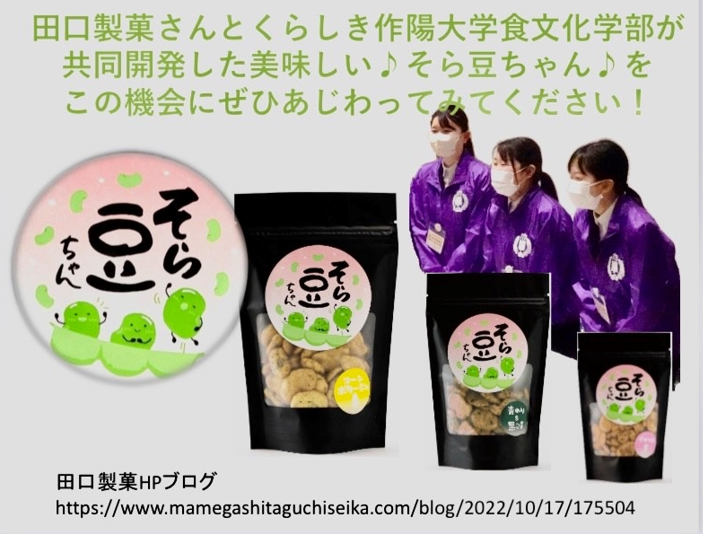 2023.06.16(金)、くらしき作陽大学食文化学部現代食文化学科 JR新倉敷駅イベントで、田口製菓様と本学が共同で商品開発した「そら豆ちゃん」をご紹介させていただきました。