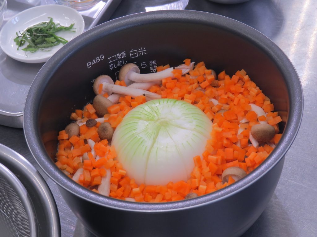 ①玉ねぎ丸ごと炊き込みご飯 ②カリカリ豚の玉ねぎごまポン酢かけ のご紹介です。