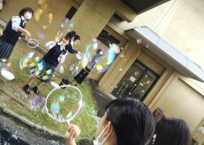 シャボン玉遊びを行い、子どもたちにとって安全な水遊びについて楽しく学びました。