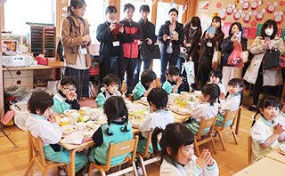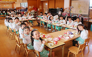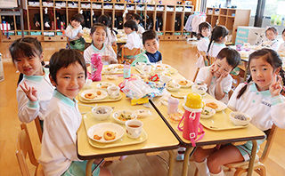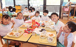 給食の時間のねらいは、「楽しい雰囲気の中で美味しく食べること」ですが、卒園後も活きる「正しい食事のマナー」を身に付けることも大切にしています。 また、年3回の食育委員会では、園の職員と保護者代表が一堂に会して、「食育」についての意見交換をしています。