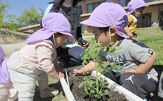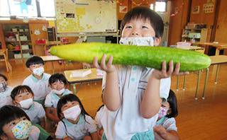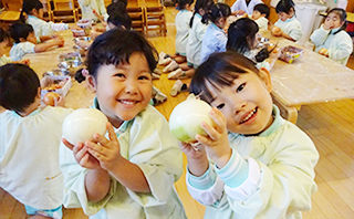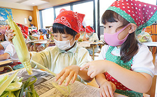 食育は、「子どもの豊かな人間性を育て、生きる力を身につける」ために行う取り組みです。乳幼児期の食事は子どもの体を作る基礎となるため、本園では、質、量、栄養を十分に考えた美味しい給食の提供を日々心掛けています。 また、子ども達の食への興味関心を高めるために、発達段階に応じて、様々な食材に直接触れる機会や、給食の下ごしらえに携わる機会も設けています。