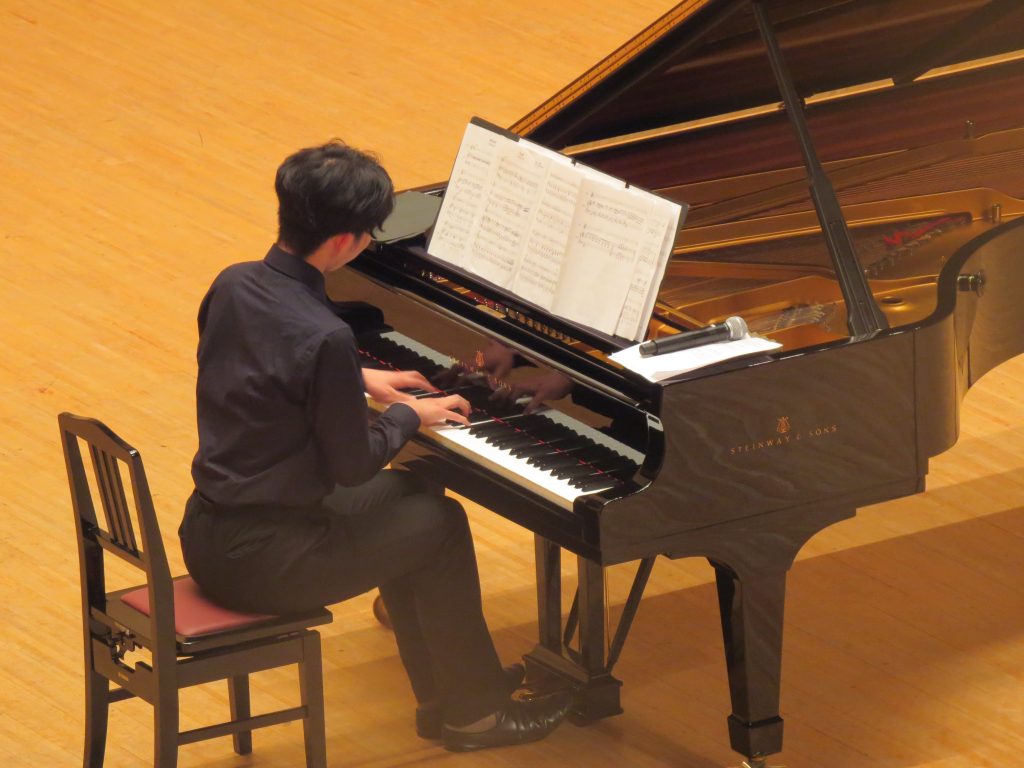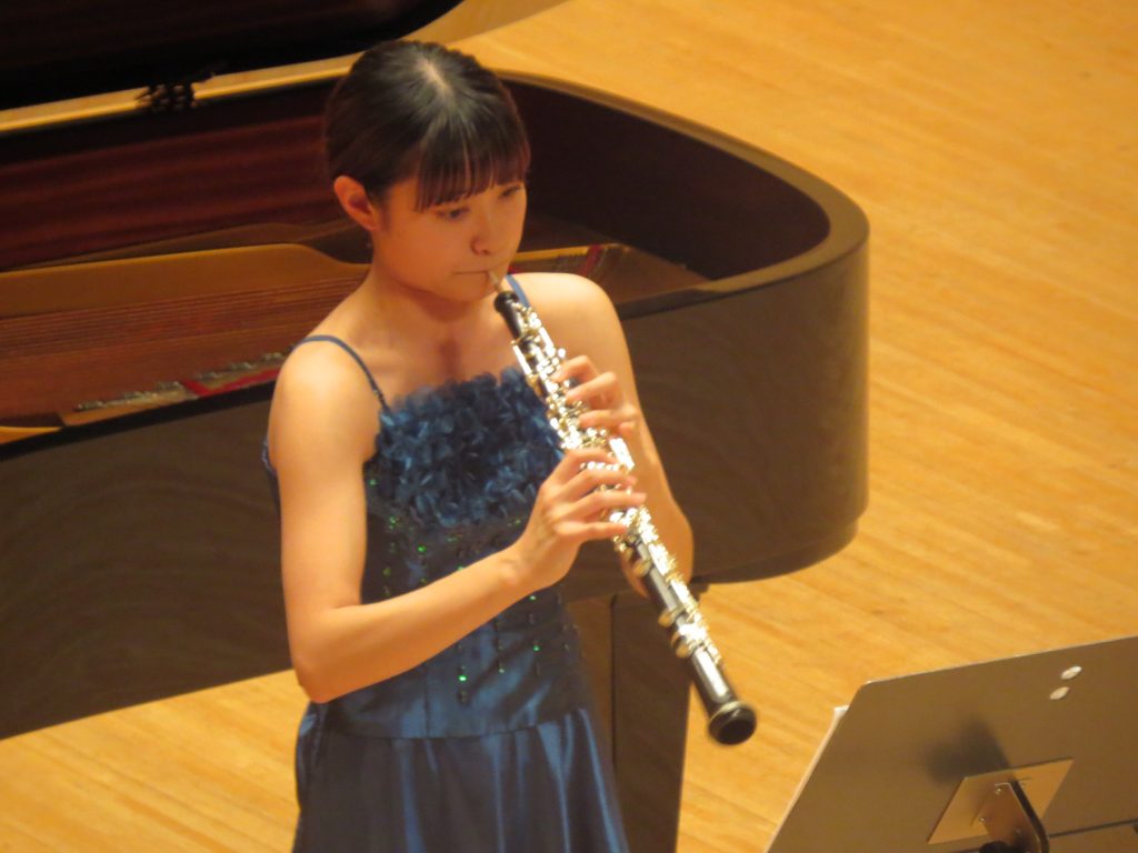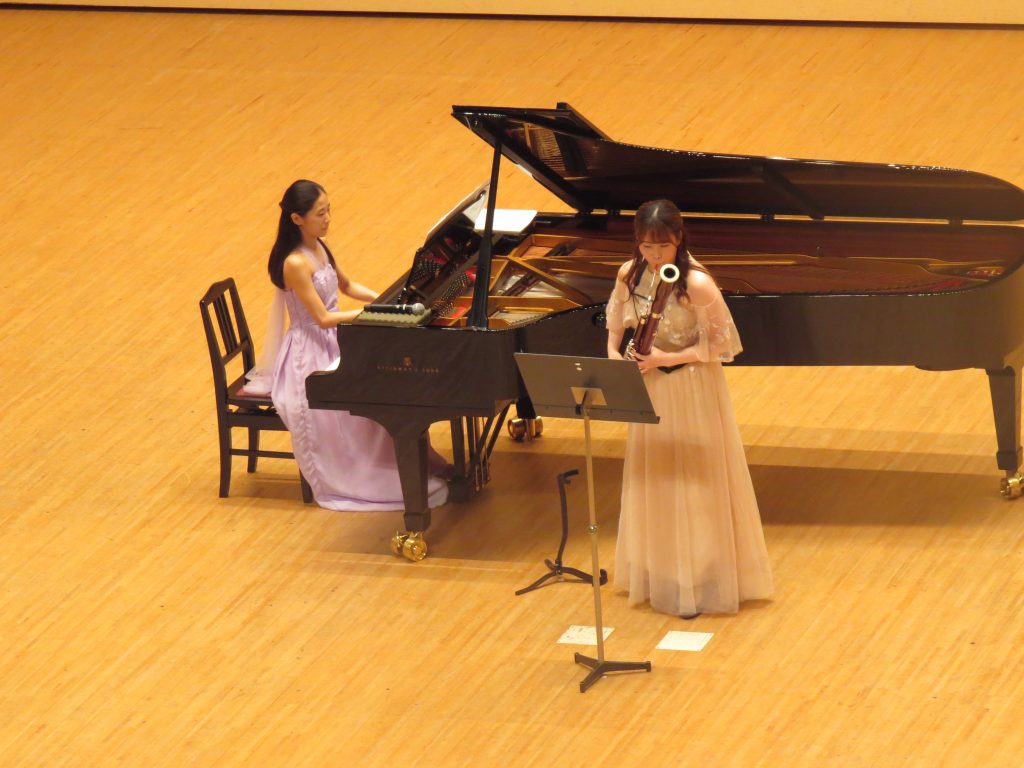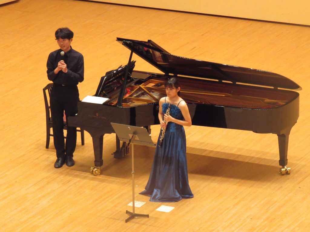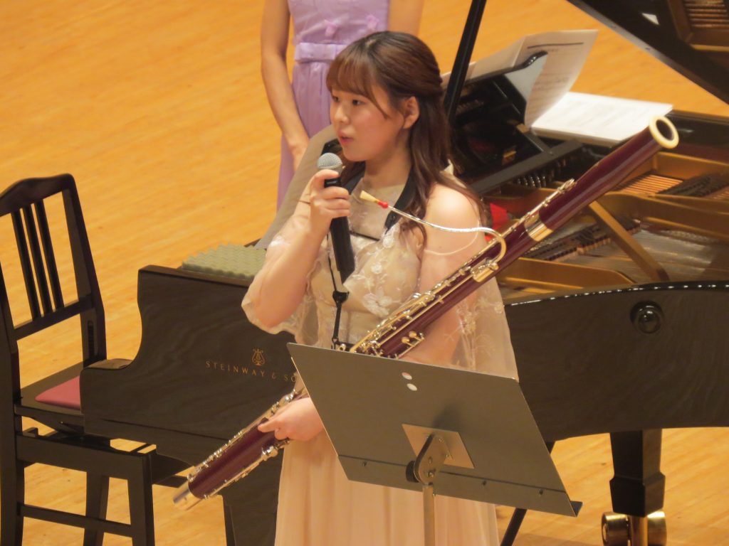 音楽学部音楽学科3年藤原さん(ファゴット) 、大学院音楽研究科2年衣奈さん(ピアノ)、大学院音楽研究科1年小椋さん(ピアノ)、短期大学音楽学科音楽専攻1年宮廻さん(オーボエ)による演奏を作陽学園高等学校の生徒全員が鑑賞しました。