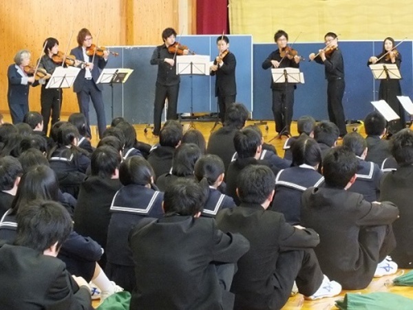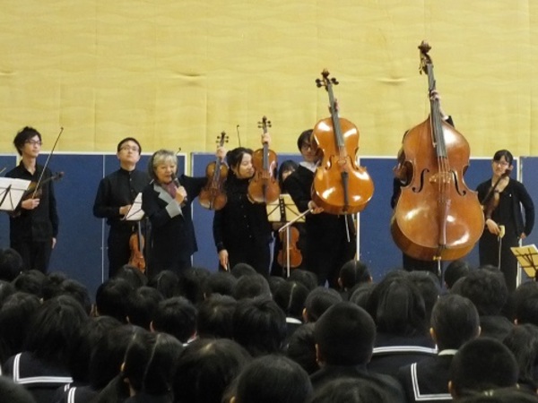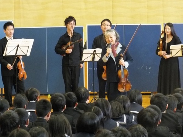 12月6日(金)総社市立総社中学校において、本学の弦楽合奏団がスクールコンサートを開催しました。森 悠子教授(Vn.)をはじめ、在学生、卒業生、エキストラによる演奏会だけでなく、弦楽器の知識等についても学んでいただきました。