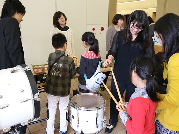 作陽JWA学生講師と一緒に、吹奏楽で定番曲の演奏や準備科(年長~小学校2年生)によるステージ、また、楽器体験や手作り楽器コーナーなど、聴くだけでなく実際に楽器を体験していただきました。