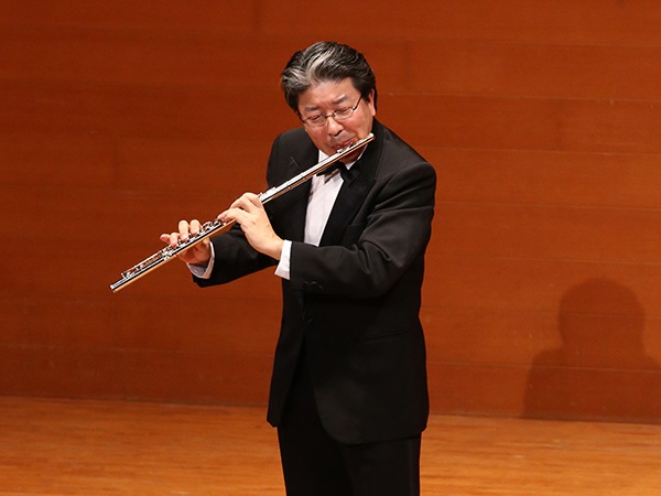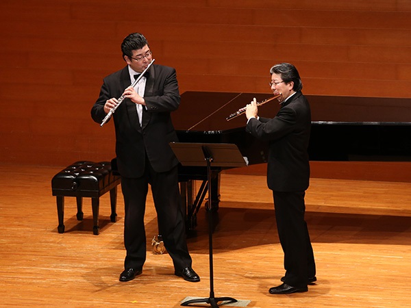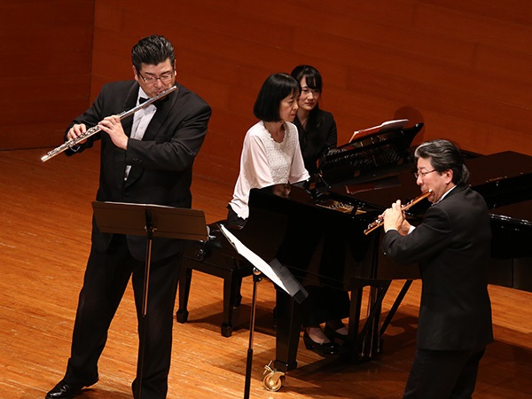 札幌交響楽団首席フルート奏者を30年務められ、今年度より本学音楽学部の教授に就任された森圭吾先生(Fl.)と、新進気鋭のフルーティスト 高橋聖純氏(Fl.)、チェンバーピアニスト(Pf.) 森可奈子氏、の饗宴が紡ぎ出す魅惑のフルート音楽の世界を堪能していただきました。