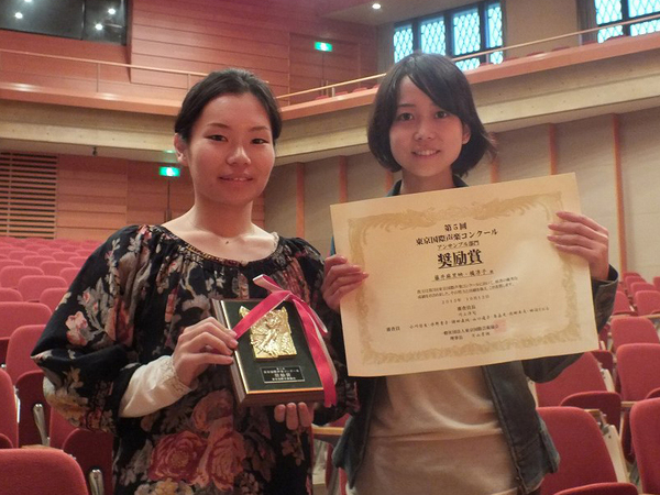 10月12日(土)にイタリア文化会館アネェッリホール(主催:東京国際芸術協会)で開催された「第5回 東京国際声楽コンクール本選」アンサンブル部門において、本学音楽学部声楽専修4年の藤井麻里映さん・橘淳子さんが奨励賞を受賞されました。